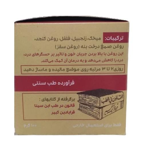 ترکیبات: میخک، زنجبیل، فلفل، روغن کنجد، روغن صمغ درخت بنه (روغن سقز)